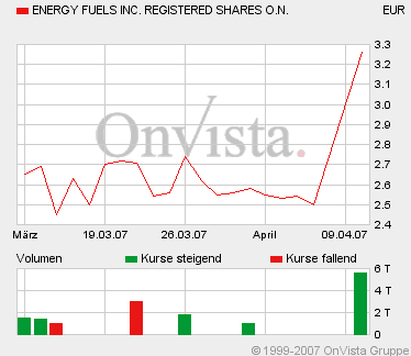 Heute läuft fast alles super, was mit Uran zu tun hat: Energy Fuels als near term producer nach längerer Dümpelphase heute in FFM + 30%. Ist schon ein wilder Markt, da kann man sich nur zurückhalten mit eigenen Prognosen. Und manchmal kommen die Bewegungen bei den Uranzwergen gerade in Frankfurt mit nur einigen tausend € zustande.