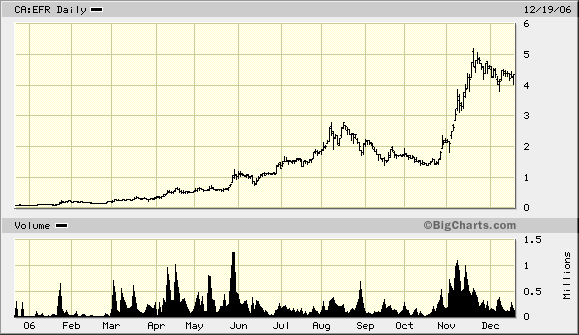 Companies that have hedged out some of their uranium in long-term contracts, and companies operating in far less mining-friendly countries are achieving valuations of 30X to 60X cash flow per share thanks to the dearth of listed uranium producers. That being the case, it is fair to say that EFR, currently trading at only 2.6X 2008 cash flow at current uranium prices, is going much, much higher.