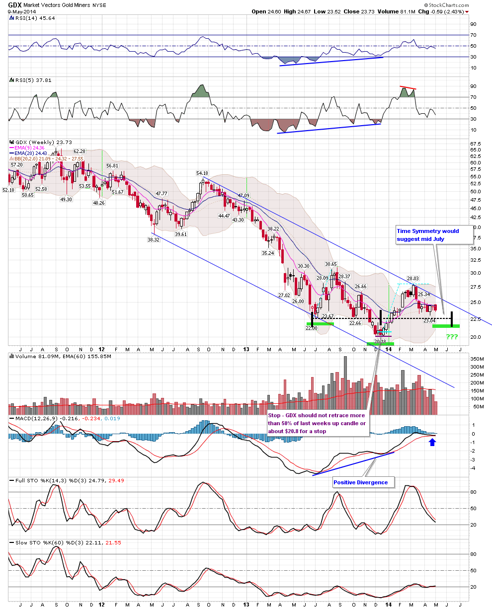 Was aber ersichtlich sein wird, ist dass die Notenbanken die Kontrolle nicht mehr haben werden. Der Grund des aktuellen Aktienbullen hat ja wenig mit richtigem Wachstum zu tun (wie es in Vergangenheit meistens der Fall war), sondern mit Verschuldung und Assetinflation, gewollt und verursacht durch die US-FED. Eine Korrektur bei Aktien ist in diesem Programm nicht inkludiert....was bedeutet, dass eine solche Korrektur die Scheinwerfer wieder auf reale Gegebenheiten lenken sollte, nämlich zuwenig Wachstum. dafür eine viel zu hohe Verschuldung, und die Abwärtsspirale kann ihren natürlichen Verlauf nehmen.Die Frage stellt sich, wie Gold sich da verhalten würde. Ich denke, es bestehen sehr gute Chancen für ein Rally. Die andere Frage: Von welchem Level aus wird Gold die Rally starten? Haben wir die Lows bereits hinter uns oder wird Gold noch fallen bis in den Frühsommer? Hier weiss ich keine Antwort. Kurzfristig gefällt mir das Bild nicht. Goldaktien sehen auch schwach aus. Hier kurzfristig runter und danach nach einem neuen Low (bei GDX knapp unter 23, Chart 2) der endgültige Boden? Oder kommt der grosse Absturz?