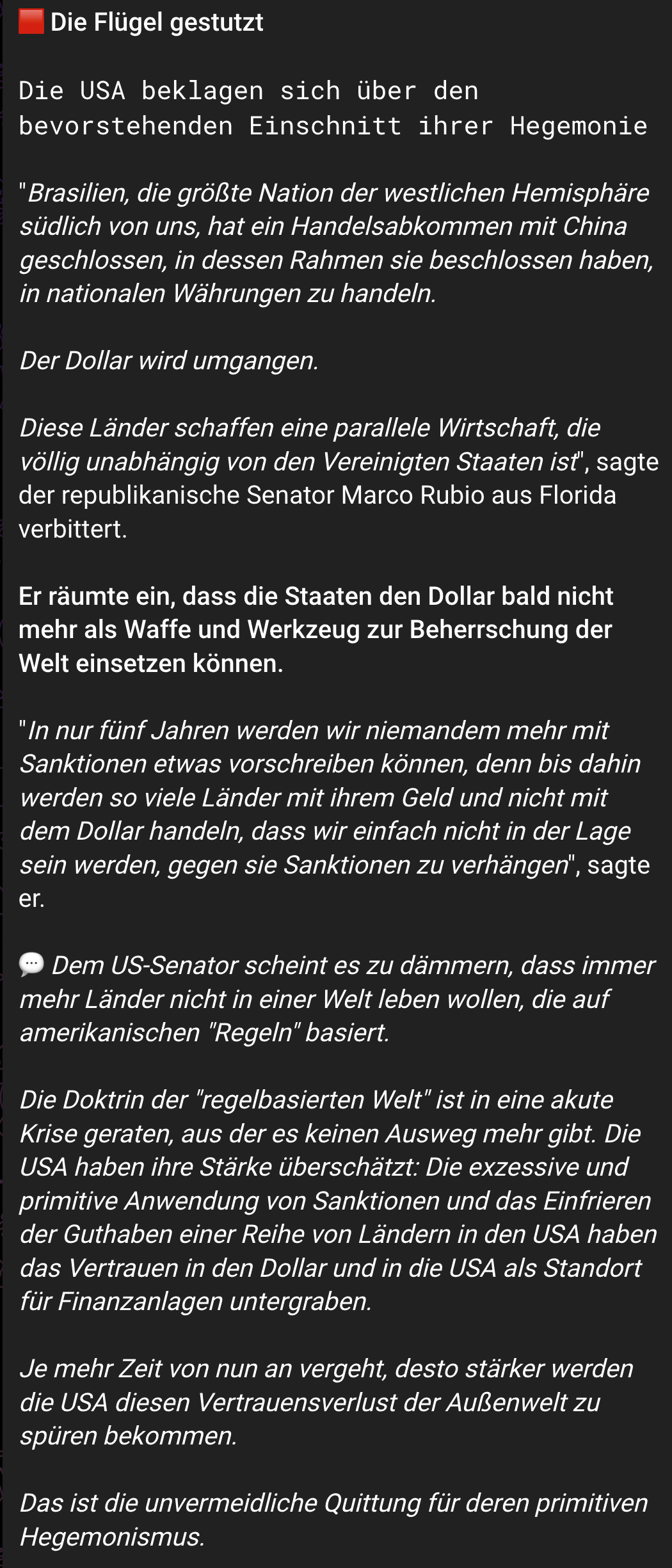"Die Umstellung auf nationale Währungen ist eine Verletzung der Rechte der amerikanischen Bürger". Das Weiße Haus drohte denjenigen Ländern mit Sanktionen, die den Dollar bei gegenseitigen Abrechnungen ablehnen."