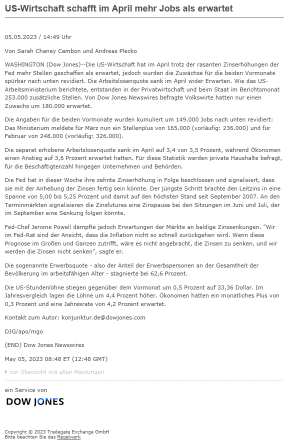 Die Zahlenkorrekturen im Detail aus der Meldung auf Tradegate: "Die Angaben für die beiden Vormonate wurden kumuliert um 149.000 Jobs nach unten revidiert: Das Ministerium meldete für März nun ein Stellenplus von 165.000 (vorläufig: 236.000) und für Februar von 248.000 (vorläufig: 326.000)." In späteren Meldungen entfällt dann die Revisionspartie... ![]()