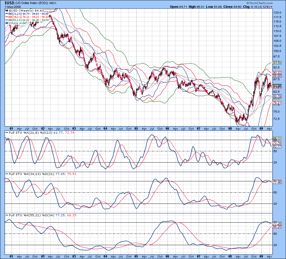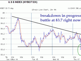 A better look at the USDollar breakdown in progress can be seen in the five-day chart. The defense of the 83.7 support level is the primary location of the battleground. It is trading at 83.75 at the moment of this written sentence. The battle is on. The USDollar is delivering a strong vote against the faulty green shoots claims motivated by ill-advised analysis, vested interest, if not survival. The USDollar is voting NO confidence to the sham bank sector claims of viability, when they are zombies with hollow cores. The USDollar is saying hard times are coming to the USEconomy, led by the manufacturing (cars in particular). Industry is ALWAYS the most important part of any economy, its fundamental value added sector, a chapter lost in the US economic history teachings in compromised universities across America. Wall Street hucksters need to read that chapter of economic history during detention after class, or better yet in prison cells......" ![]()