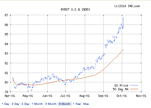The Dollar Index has gone up 12 weeks in a row. Nothing goes straight up or straight down. But we forget that the dollar index doesn’t really measure the dollar. It is made up of the Yen, and the Euro and the British Pound and some other currencies.