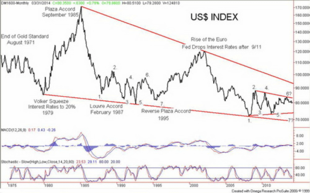 „...Reviewing the monthly chart below, we see nothing of the sort currently when considering a “blow off” move in USD. What we see is a currency that made its real blow off move in 1985 to climax the Volcker interest rate hiking regime...