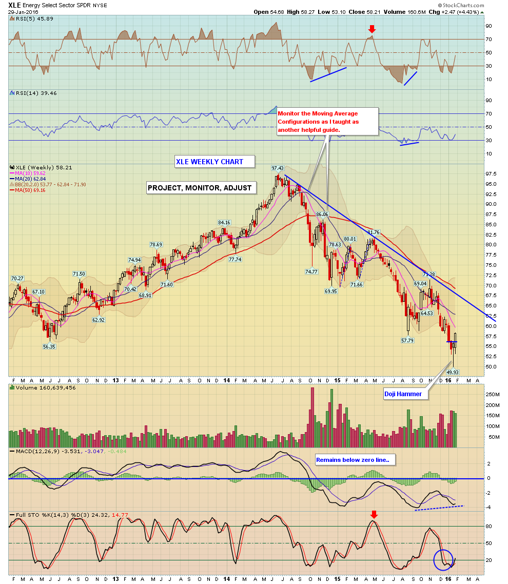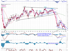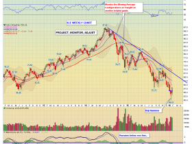 3: XLE (Ölaktien): Boden mit Divergenz: Ziel Abwärtstrendlinie bzw. 50 MA