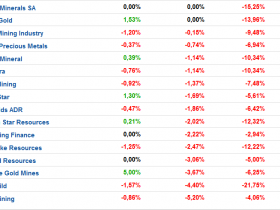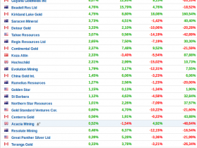 In der Tabelle sind jetzt alle Werte des GDXJ vertreten. Nur die Daten von Real Gold Mining mit 0,01 % Indexanteil fehlen.In den beiden ersten Tabellen sind die Werte mit einer besseren Performance, in der dritten Tabelle mit einer schlechteren Performance im Vergleich zum GDXJ. In der Tabelle 4 sind die Wochenverlierer.