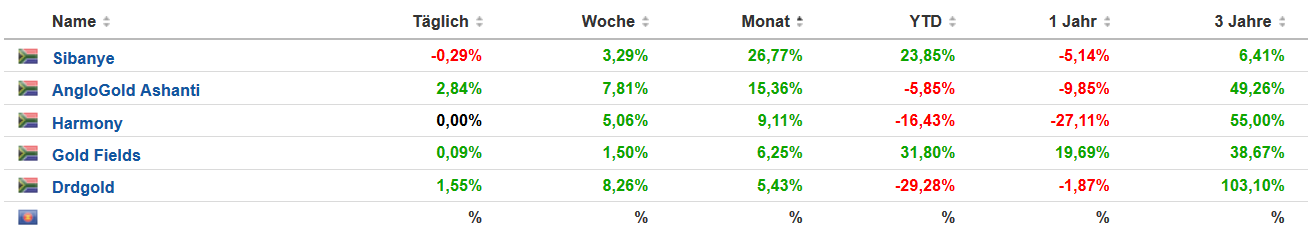 bei den Südafrikanern musste ich etwas tricksen. Da die Performance der Gruppe JGLDX nicht erscheint, habe ich für die Minen eine Gruppe JGLDX (FTSE/JSE Gold Mining) erstellt.