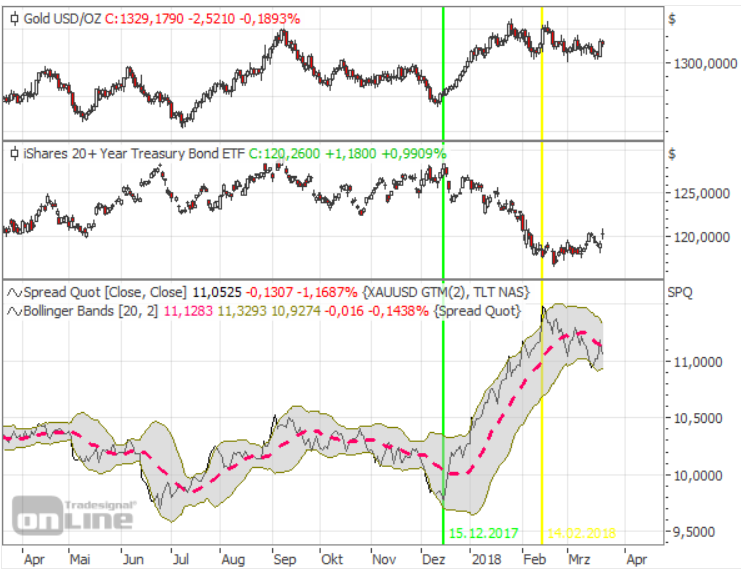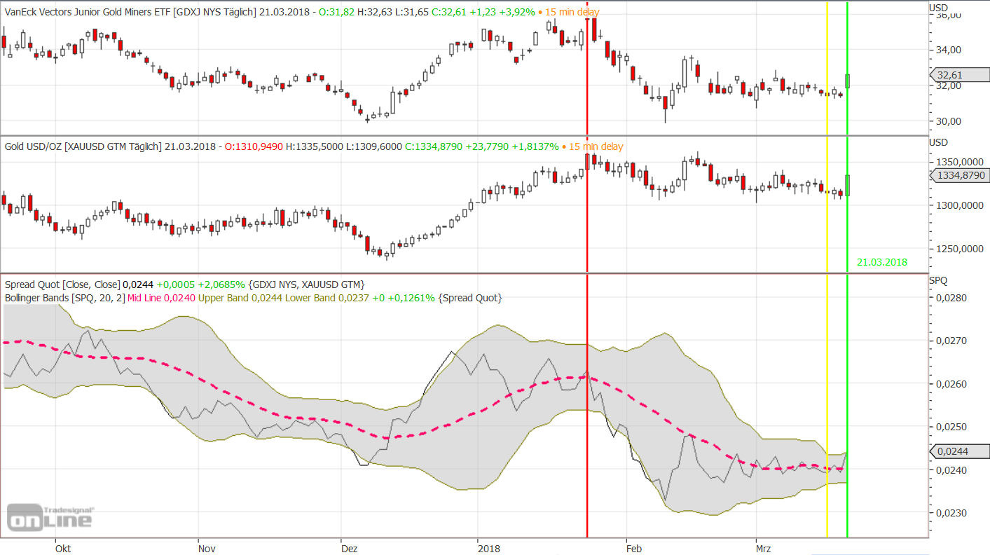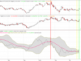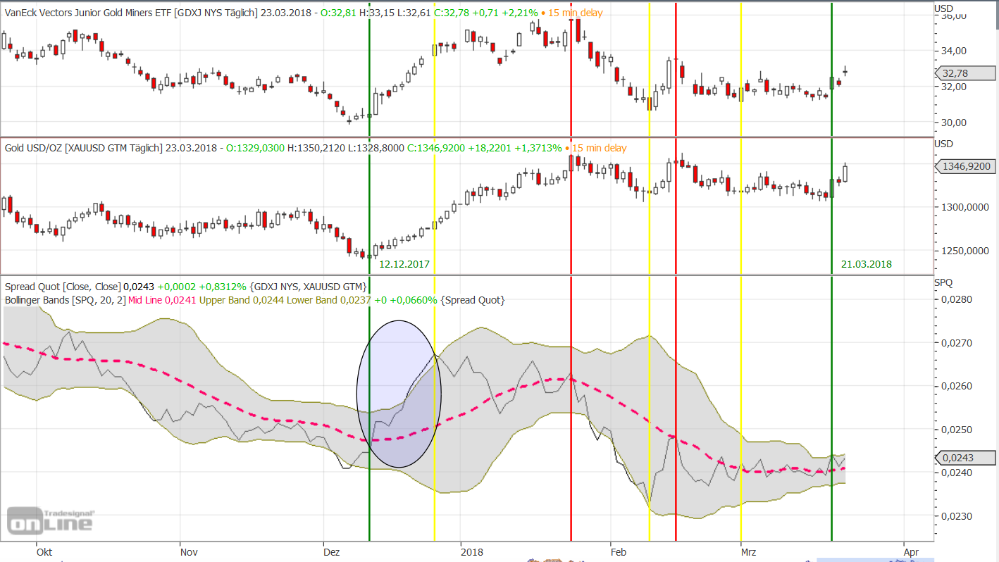 In der positiven Phase (grün) zeigen Minen (Beispiel GDXJ) relative Stärke zu Gold. Die Quote GDXJ zu Gold steigt und liegt über dem mittleren, roten Bollingerband. Diese Situation hatten wir z. Bsp. ab dem 12.12.2017. Noch ist die Stärke der Aufwärtsbewegung schwächer.