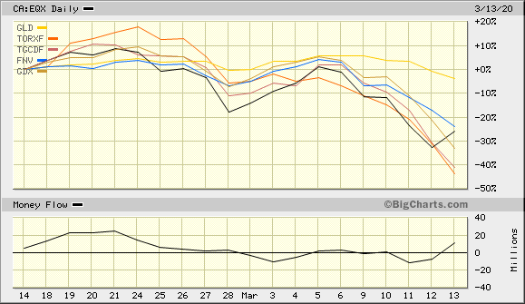 EQX wurde wie die Peer nach unten geschlagen, aber der Aufwärtshaken sieht gut aus, sh. Chartvergleich mit einigen Peer, FNV und GLD.