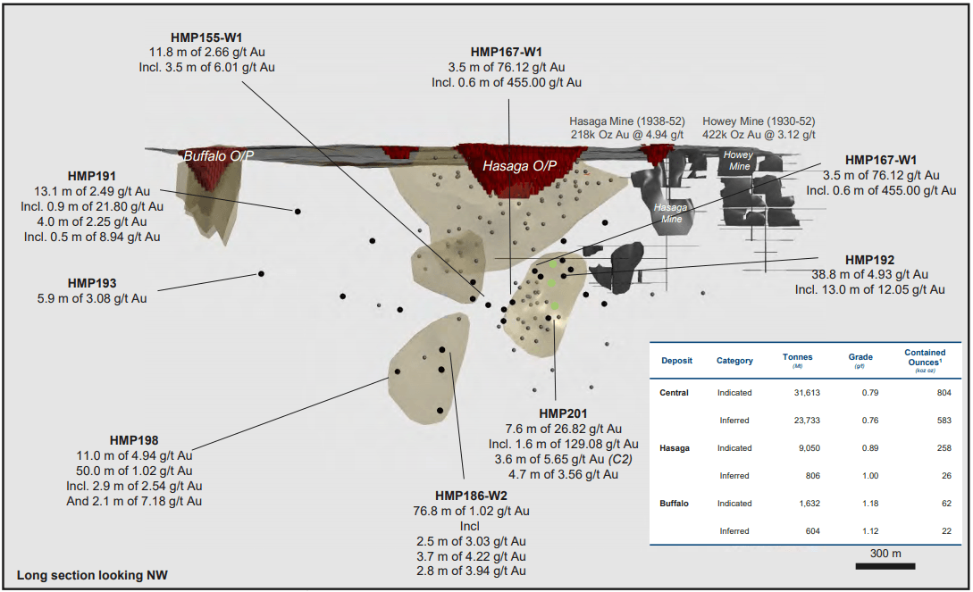 "Die Projekte Hasaga und Rahill-Bonanza befinden sich in Red Lake, Ontario. Hasaga war die erste Mine im Red Lake Camp, die jedoch nur eine begrenzte moderne Exploration erfahren hat. Premier Gold konnte im Tagebau Ressourcen von 1,755 Mio. toz Gold (1,124 Mio. toz angezeigt, 631.000 toz abgeleitet, bei Goldgehalten von 0,83 g/t Gold bzw. 0,78 g/t Gold) abgrenzen. Eine unterirdische Ressourcenschätzung wird in Kürze erwartet. In einer Tiefe von etwa 750-1.000 Metern erbohrte Premier Gold 76,12 g/t Gold über 3,5 Meter, 4,93 g/t Gold über 17 Meter oder 26,82 g/t Gold über 7,6 Meter..."