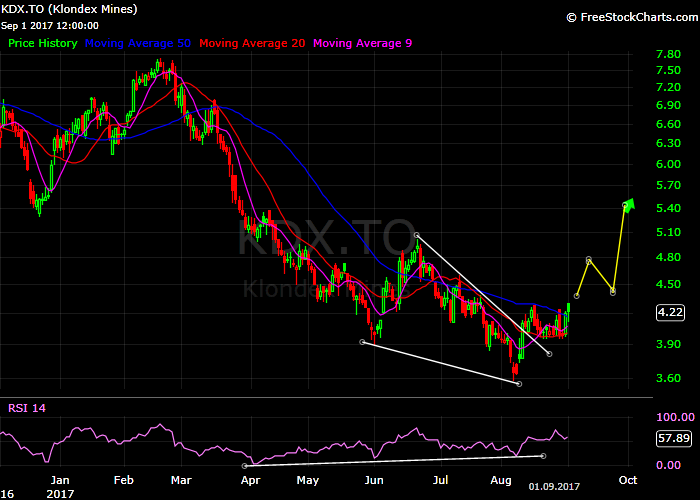 Erwartung: Dies wird gelingen. 9 MA und 20 MA nun aufwärtsgerichtet und bieten Unterstützung. Unter 4 CAD $ wird KDX nicht mehr fallen. Gut zu sehen: Der 20 MA war und ist relevant.