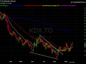 Für einmal die grössere Sicht im Wochenchart. Hier ist auch ersichtlich, dass sich KDX.TO untypisch für Goldaktien entwickelt hat, weshalb die grössere Korrektur in den vergangenen Monaten auch keine Überraschung darstellt. Während die meisten Goldaktien vor Jahren ihr Hoch erreichten, dementsprechend schon seit langem korrigieren bzw. Ihr Tief womöglich bereits Januar 2016 erreichten, hat KDX.TO im Jahr 2016 ein Allzeithoch erreicht, das 2017 fast nochmals erreicht wurde. Unabhängig vom Goldpreis erscheint eine grössere Korrektur sinnvoll und logisch.