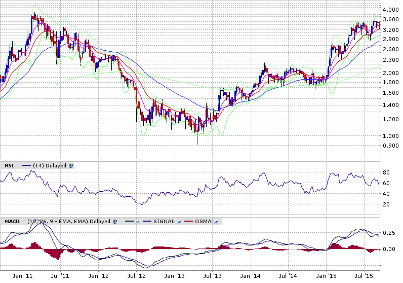 "Klondex Mines (KDX, TSX) has been another strong performer in the weak Gold price environment over the last year, given its high-grade operation in Nevada, and many analysts jumped all over this one to the point where overbought technical conditions emerged during Q2 as KDX surged to a multi-year high of $3.50 last month…a healthy pullback has been underway since then…a retreat to the nearest Fib. support level could occur, or at least a test of the rising 100-day moving average (SMA) around $3.00…
