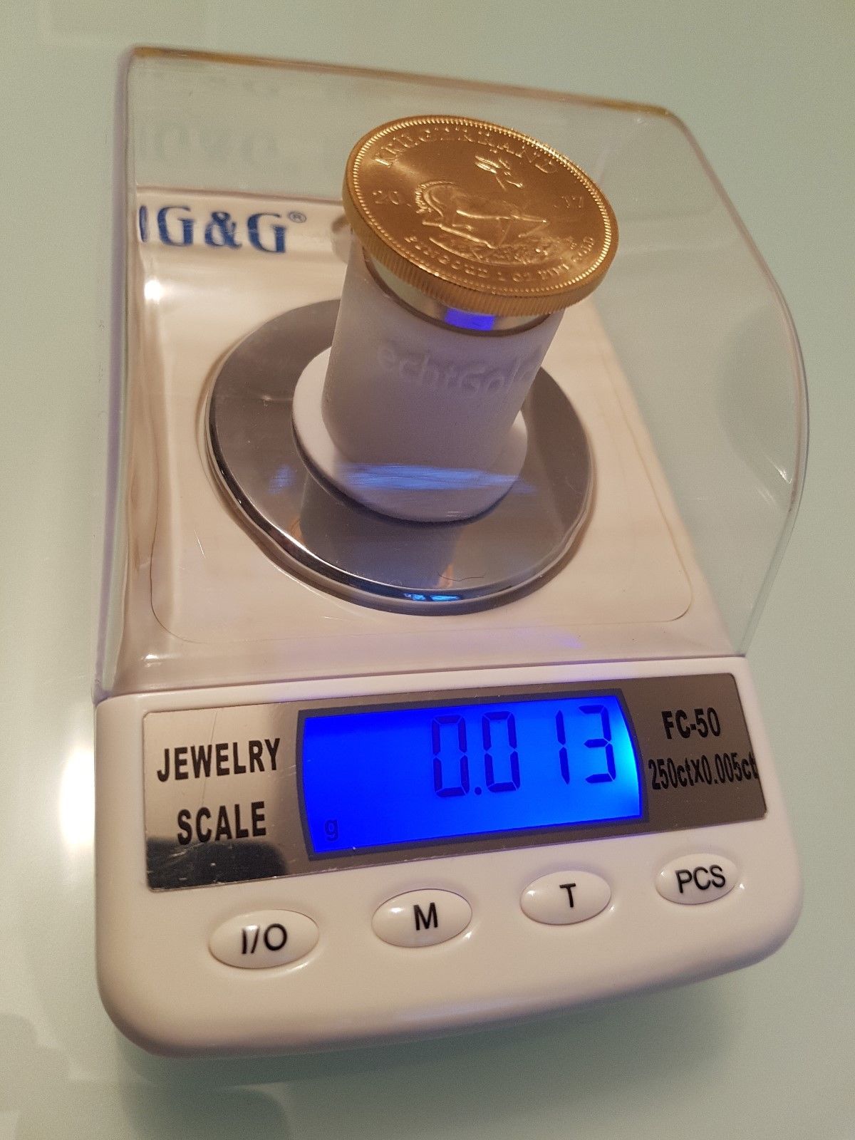 Gold stößt halt ab, Waage zeigt Gewicht.