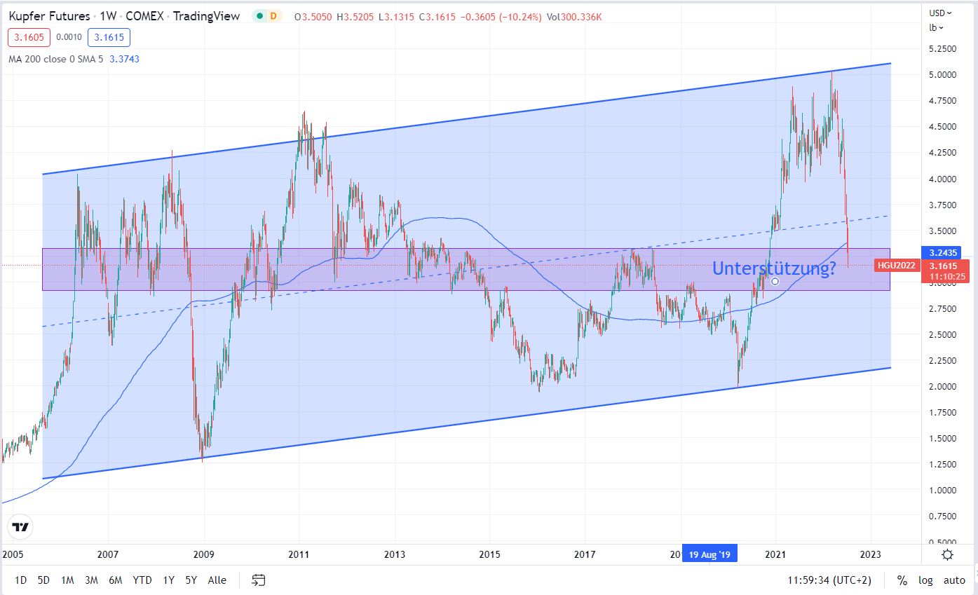 Der Kupferpreis ist bereits um 38% vom letzten Hoch gefallen und befindet sich nun in einem spannenden Bereich. Wird hier nun Kupfer Unterstützung finden und sollte man bereits Kupferwerte einsammeln oder wir dieser Trendkanal ausgenutzt und wir fallen weiter nach unten durch? Hohe Rezessionsängste sollten ja bereits im Kurs enthalten sein ... bin auf Eure Meinungen gespannt!