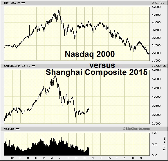 Ja, und die platzt eben gerade, diese Bubble. Man sieht es ja auch an dem massiven Abwärtsdruck auf den Shanghai Composite im Vergleich zur Nasdaq 2000 unten; trotz der gigantischen Stützungsmaßnahmen durch die chinesische Regierung, wohlgemerkt!