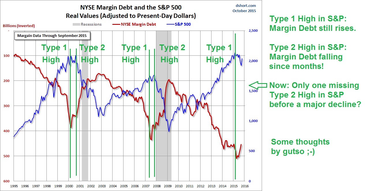 Außerdem habe ich in eine der Grafiken in Grün ein paar meiner Gedanken eingezeichnet, es ist die dritte am Schluss. Nämlich, dass es zwei Typen von Highs im S&P zu geben scheint, solche unmittelbar vor dem Margin Debt Peak und solche danach! Wir sind demnach auf dem Weg auf das bearishe Typ 2 Hoch, - wenn es wieder so kommt.