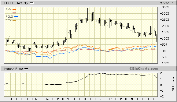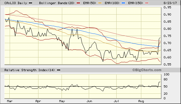 Die Bodenbildung bei LIO, nach dem steilen Anstieg 2016, könnte noch nicht abgeschlossen sein und bei einem Rückgang des Goldpreises in Richtung 1245 $, könnte LIO durchaus bei 0,40 C$ auspendeln.