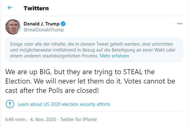 "We are up BIG, but they are trying to STEAL the Election. We will never let them do it. Votes cannot be cast after the Polls are closed!"
