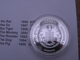 Mongolei 2.500Tugrik 1994 5oz. Silber Jahr des Hund für 888,88€ + 8,88€ Versand Deutschland