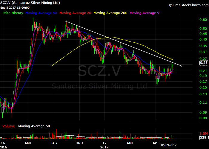 Kleiner Produzent in Mexiko. SCZ.V wird wohl mit einem Hebel auf den Silberpreis mitgeschwemmt. Gestern mit einem sehr guten Tag.Chart 1 daily: Nun müsste aber die Bestätigung kommen und die Trendlinie in den nächsten 2 bis 3 Tagen definitiv geknackt werden. Die Anordnung der MA's ist gut, allerdings durch den gestrigen Monstermove hat man sich bereits arg entfernt kurzfristig. Optimal wäre 1 bis 2 Tage seitwärts/kleine Konsolidierung, damit MA's aufholen können, und dann mit Schmackes nach oben weg.