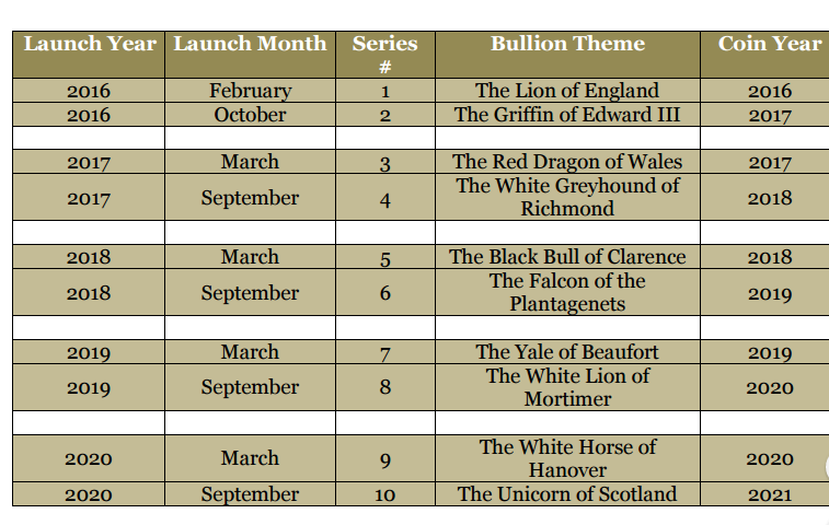 Alles anzeigengibt es mittlerweile zuverlässige/gesicherte Informationen über die Ausgabehäufigkeit der Queen's Beasts - Serie ? (ein oder zwei Ausgaben/Jahr)
