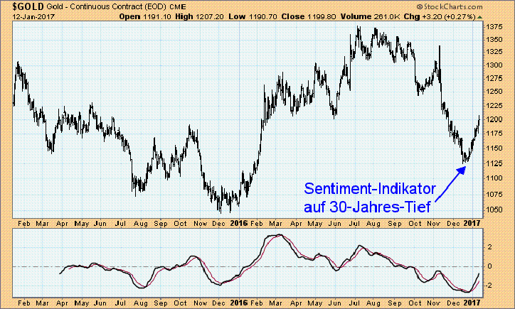 ""Kaufgelegenheit: Gold-Sentiment-Indikator erreicht tiefsten Wert seit 30 Jahren“, titelte ich in meinem Marktkommentar vom 23. Dezember 2016. Ich hoffe sehr, dass Sie diese Kaufgelegenheit wahrgenommen und sich auf diese Weise selbst ein schönes Weihnachtsgeschenk gemacht haben. Immerhin ist der Goldpreis seither schon um 6% gestiegen, wie Sie auf dem folgenden Chart sehen.