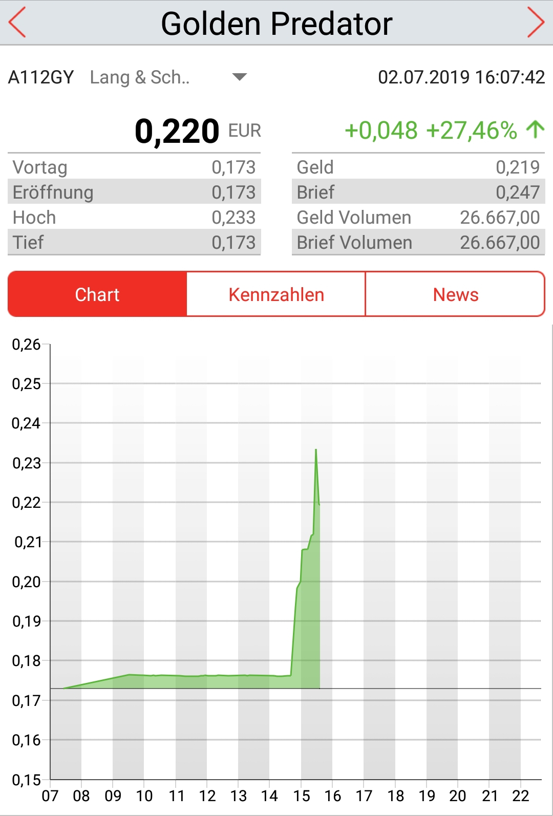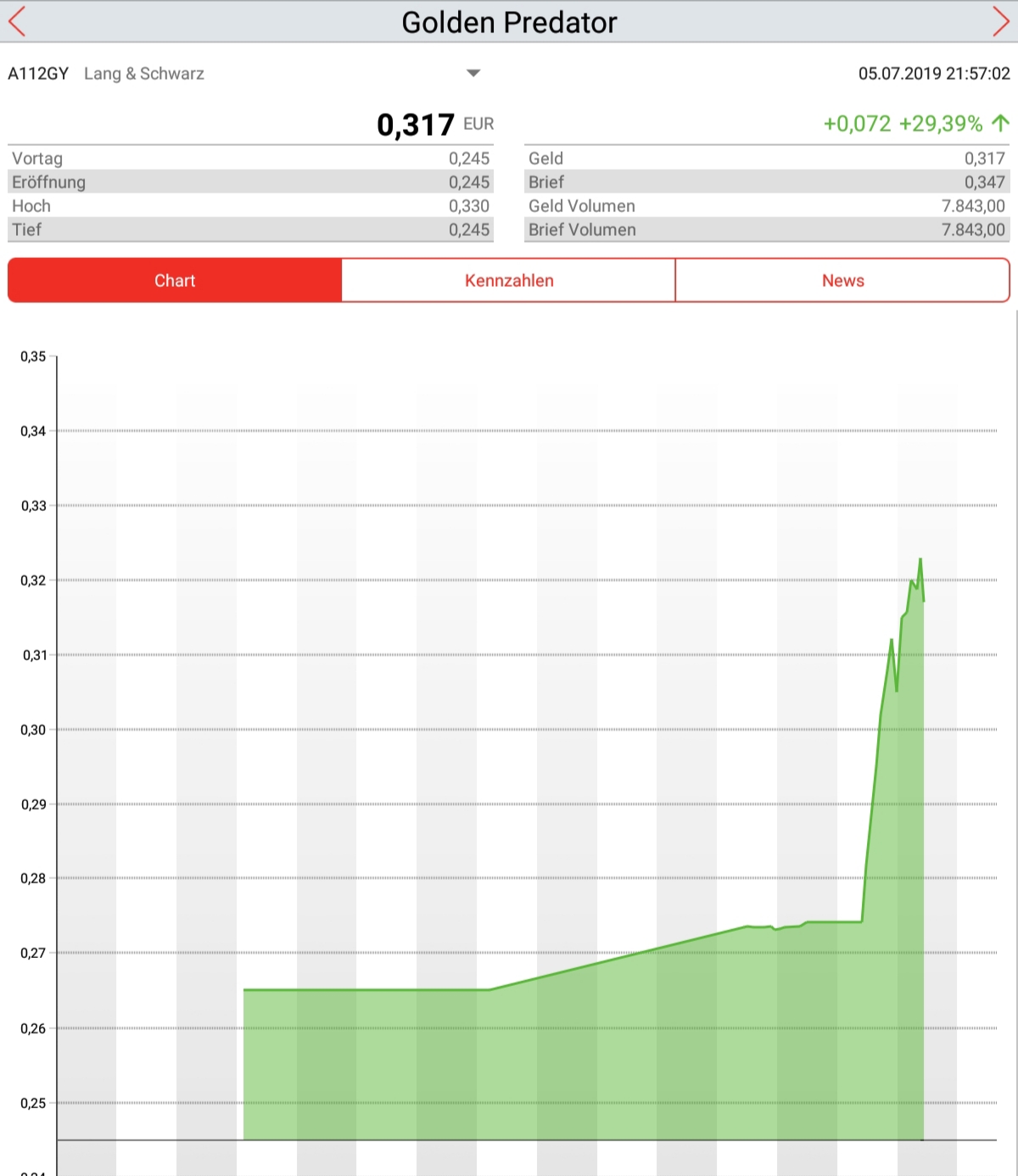 Rekordverdächtige + 269 % Kurssteigerung in genau 3 Wochen von 0,175 auf 0,47 C$ katapultierten den als kleinen Beiwert angedachten Zwerg in die obere Depothälfte und macht seinem Namen "Goldenes Raubtier" alle Ehre. ![]()