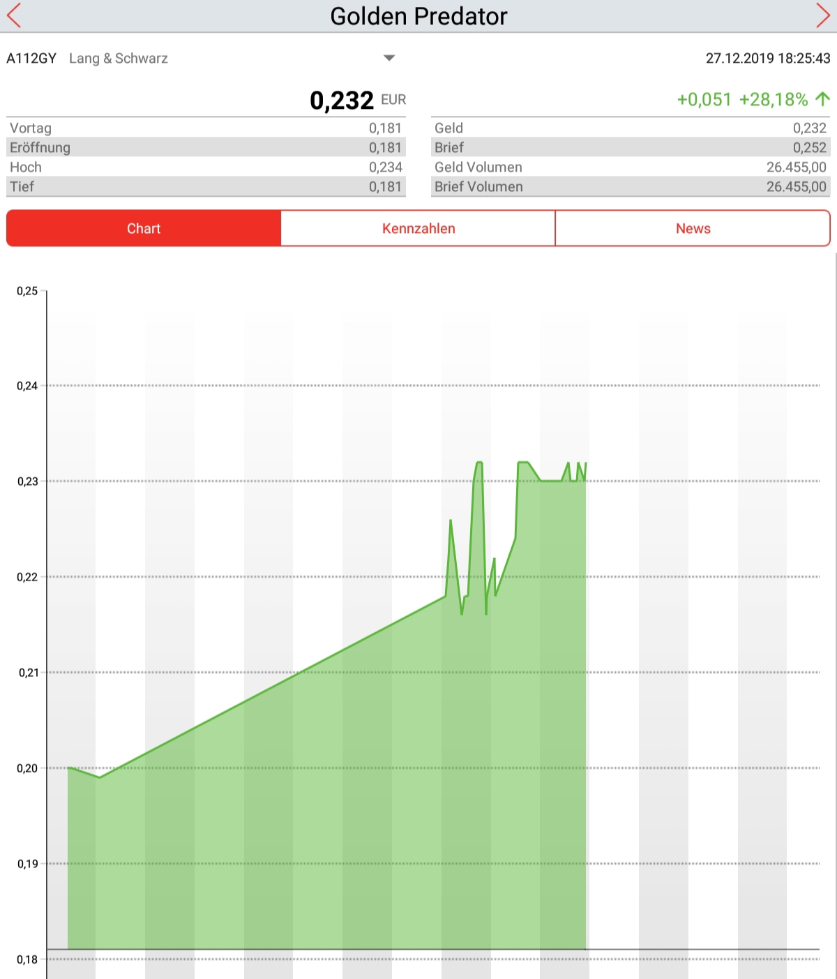 Gestern korrigierte sie nach dem steilen Anstieg von 0,445 auf 0,38 C$, hab dann noch mal zugefaßt.