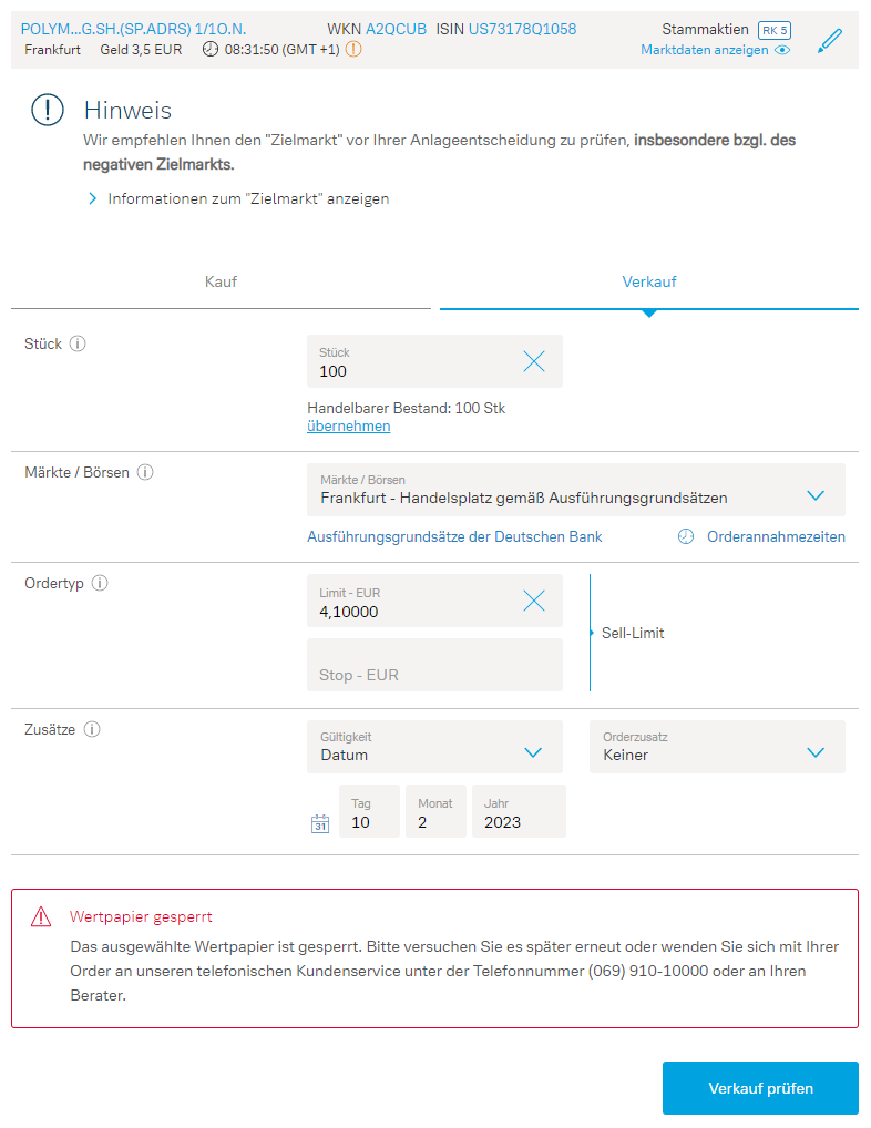 So euphorisch vor einer Woche geschrieben, schon das Gegenteil bewiesen bekommen. Letzte Woche konnte ich noch eine Order platzieren, diese Woche lehnt mir sowohl Postbank als auch Deutsche Bank (technisch inzwischen identisch) jegliche Order zu den Polymetal-ADR in Frankfurt ab, "Wertpapier gesperrt", egal ob Kauf oder Verkauf. siehe Bilder unten.