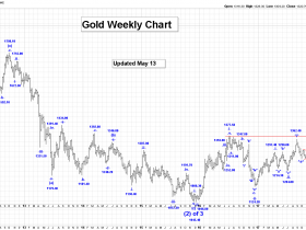 Longer term, our first and second projections for the end of wave -iii-, as shown on the Weekly Gold Chart, are: