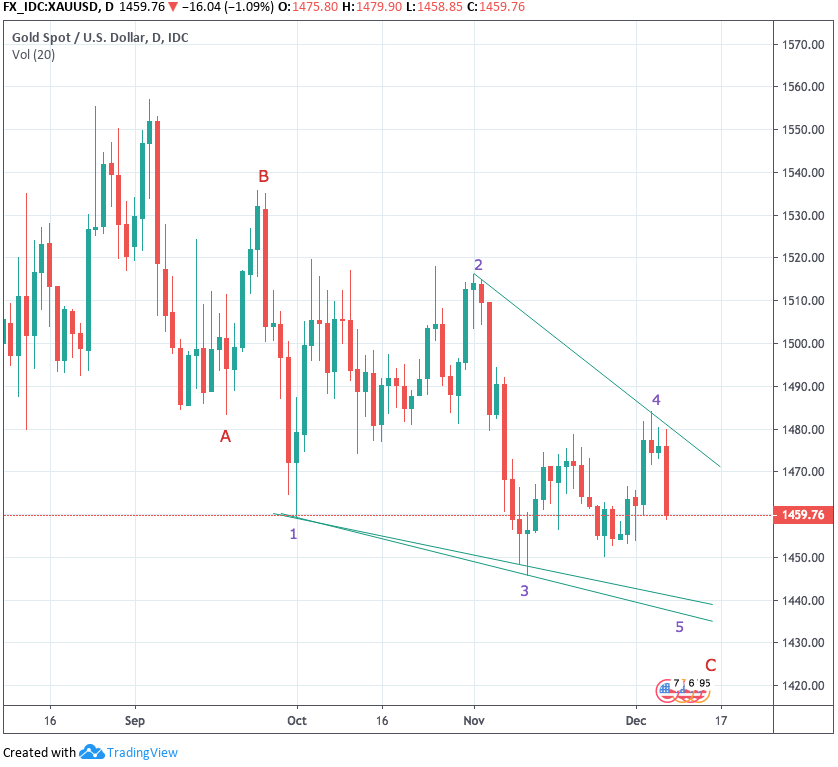 Möglich wäre noch ein EDT in Richtung um die 1.440 $+/-. (Welle 5 der C der 4 eines möglichen EDT´s)