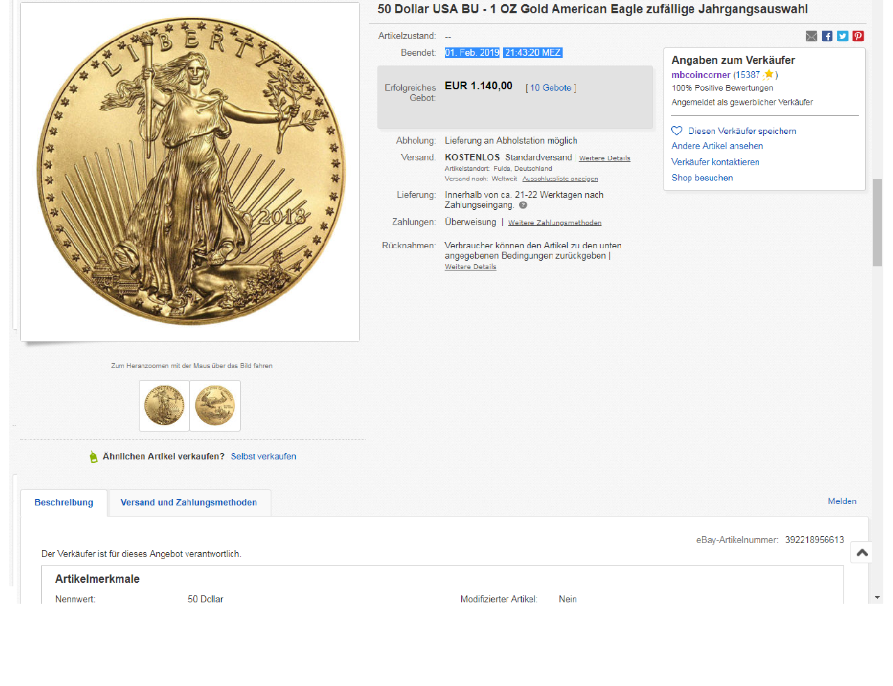 01.02.2019 den goldenen American Eagle gekauft hat und schon kurz darauf seine angeblich neutrale Bewertung des eBay Verkäufers abgegeben hat, so hat er die Bewertung doch unzweifelhaft abgegeben obwohl er den Artikel, der ja eine Lieferzeit von 1 Monat hatte, noch nicht erhalten hat.