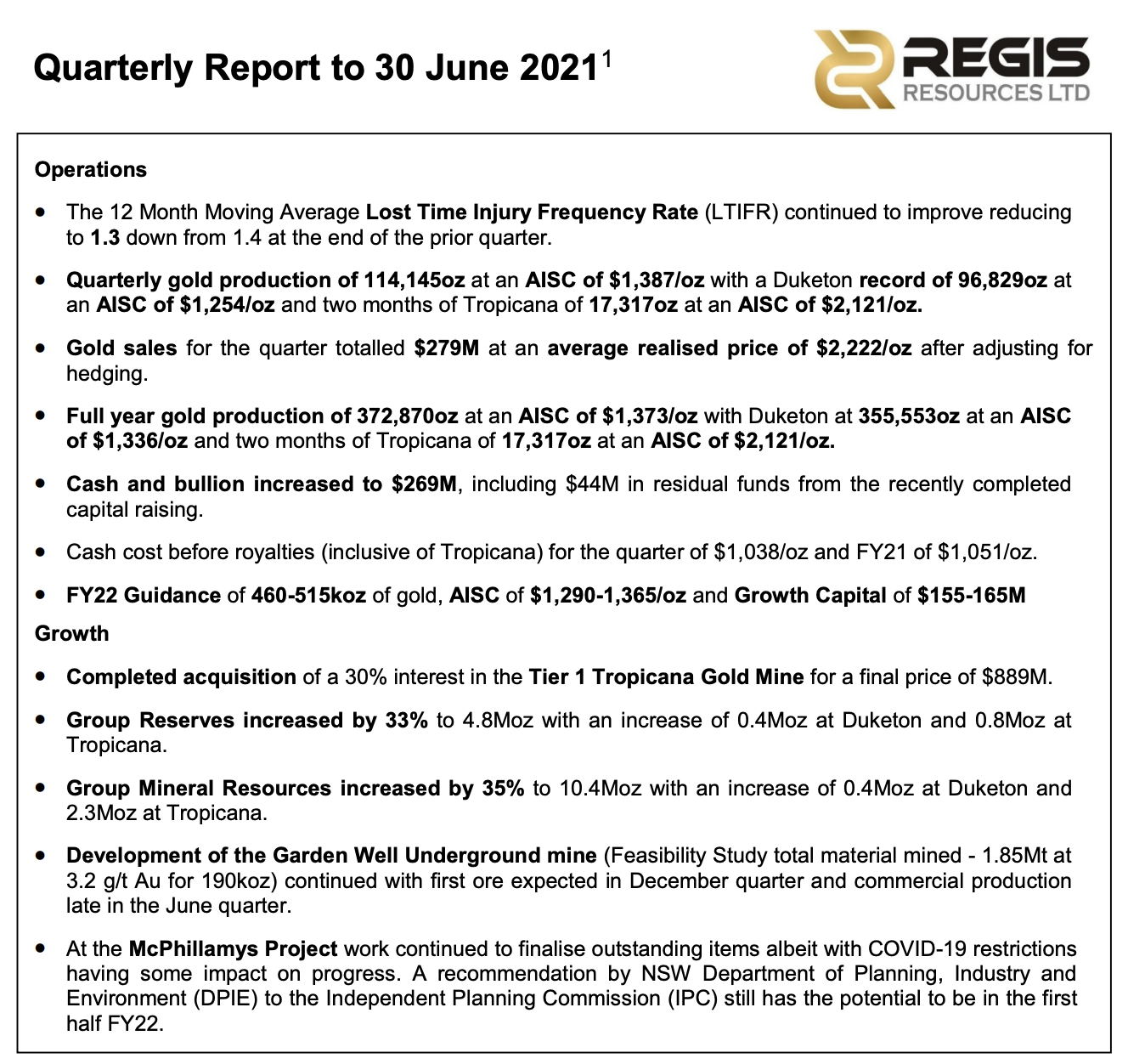 Regis Resources Limited’s Financial Report for the year ended 30 June 2021 will be lodgedwith the ASX pre-opening on Tuesday 31 August 2021.