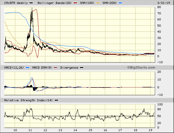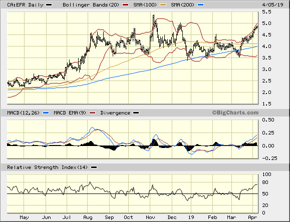 EFR bereitet gegenwärtig Freude, nur so der schlichte Chart, links. Zügiger Kursanstieg von 3,5 in Richtung 5 C$. Dort wartet Widerstand.