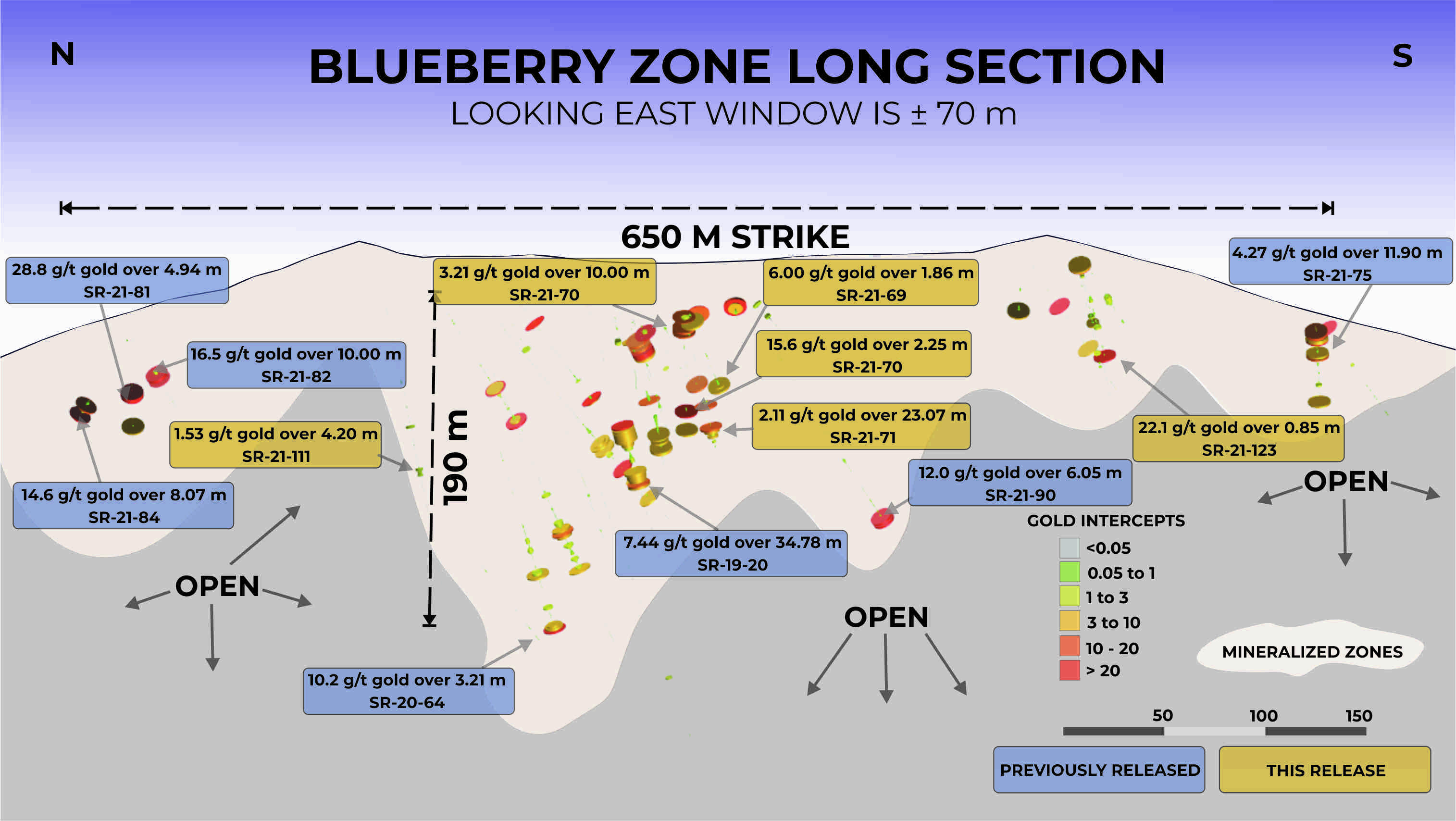 "Übersichtsplan der Zone Blueberry, der die Projektion des abgeleiteten N-S-Mineralisierungstrends, die Bohrabschnitte aus den Jahren 2019 und 2020 sowie die jüngsten Ergebnisse aus dem Jahr 2021 hervorhebt - die goldfarbenen Ergebnisse stammen aus dieser Pressemitteilung.