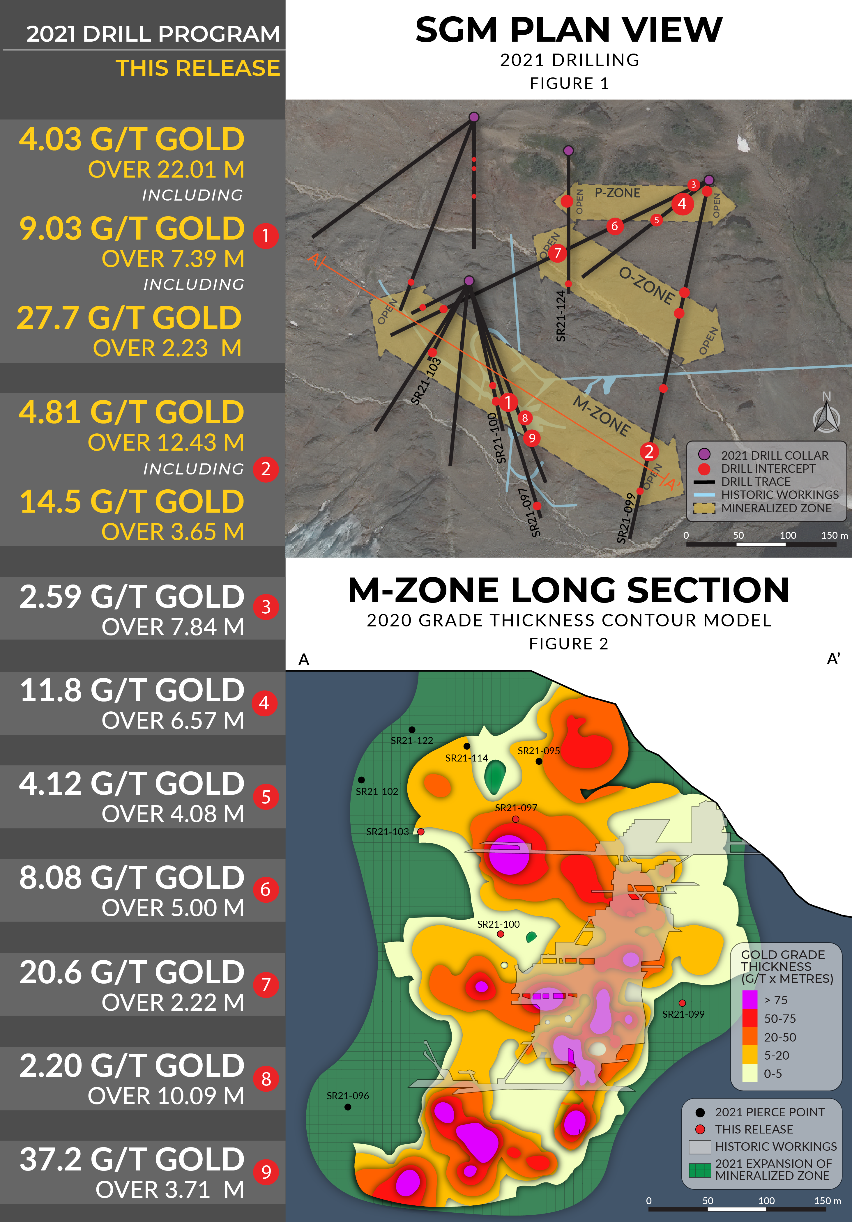 Die Ergebnisse von 2019 ergaben 7,44 g/t Au auf 34,78 Metern. 2020 lieferte Scottie 22,3 g/t Au auf 6,10 Metern, während die in diesem Jahr gebohrten Löcher 16,5 g/t Gold auf 10 Metern und 28,8 g/t Gold auf 4,94 Metern ergaben. In der eigentlichen Mine Scottie Gold selbst hat das Unternehmen 109,4 g/t Gold auf 2,53 Metern gefunden....