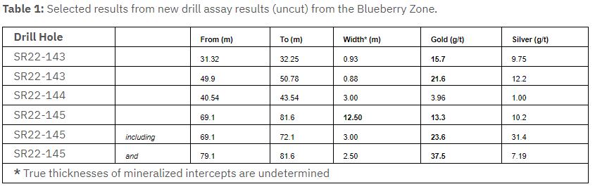 "Unser Explorations- und Bohrprogramm 2021 hat die Zone Blueberry Contact entlang des Streichens und in der Tiefe erfolgreich erweitert. Die Bohrergebnisse weisen weiterhin hochgradiges Gold auf einer Streichenlänge von mindestens 700 m und in einer Tiefe von 225 m auf", kommentiert President und CEO Brad Rourke: "Da das System in alle Richtungen und in der Tiefe weiterhin offen ist, wird sich unser Programm 2022 darauf konzentrieren, die Größe der Zone durch die Erprobung aggressiver Step-Outs entlang der Struktur deutlich zu vergrößern. Die Fortschritte, die unser geologisches Team in diesem Sommer erzielt hat, haben aus detaillierten Kartierungen und geophysikalischen Untersuchungen äußerst aussichtsreiche Ziele hervorgebracht, die die Zone um Hunderte von Metern entlang des Streichens erweitern könnten. Mit mehr als 15.000 geplanten Metern ist das Team mit der Planung einer weiteren äußerst erfolgreichen Saison beschäftigt."