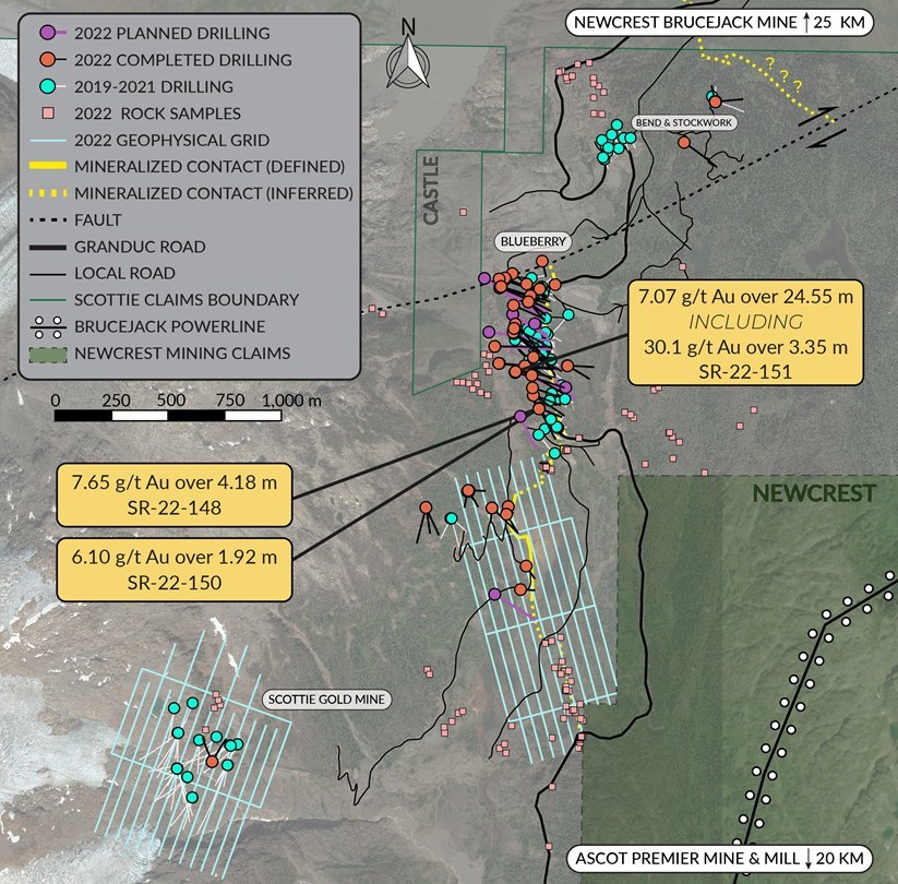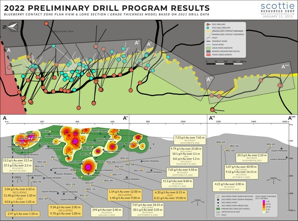 Scottie Resources Extends Depth Of Blueberry Contact Zone To 360 Metres With Intercept Of 7.07 g/t Gold Over 24.55 Metres