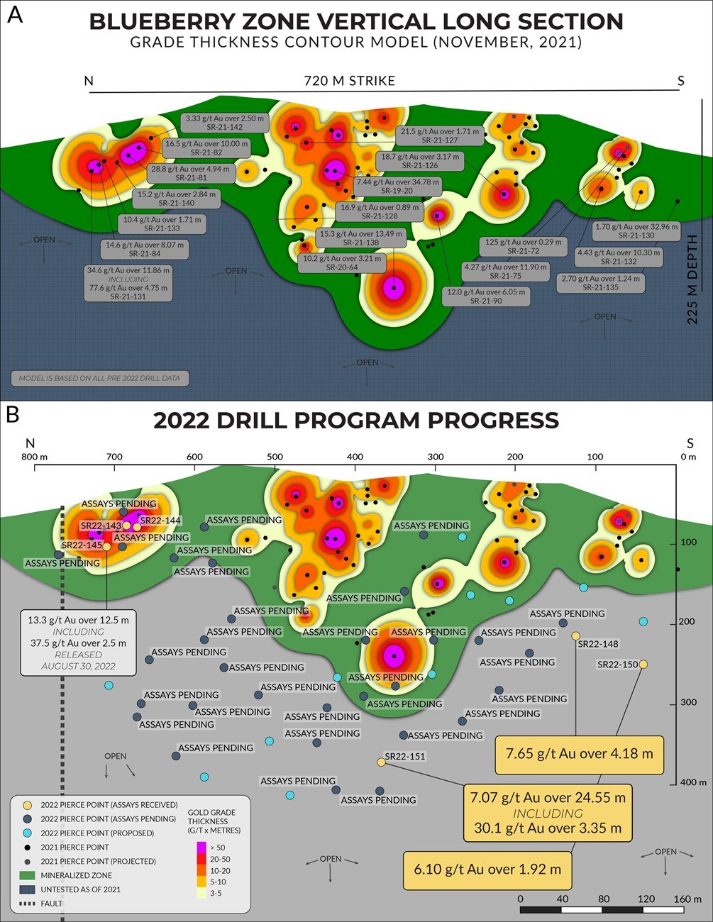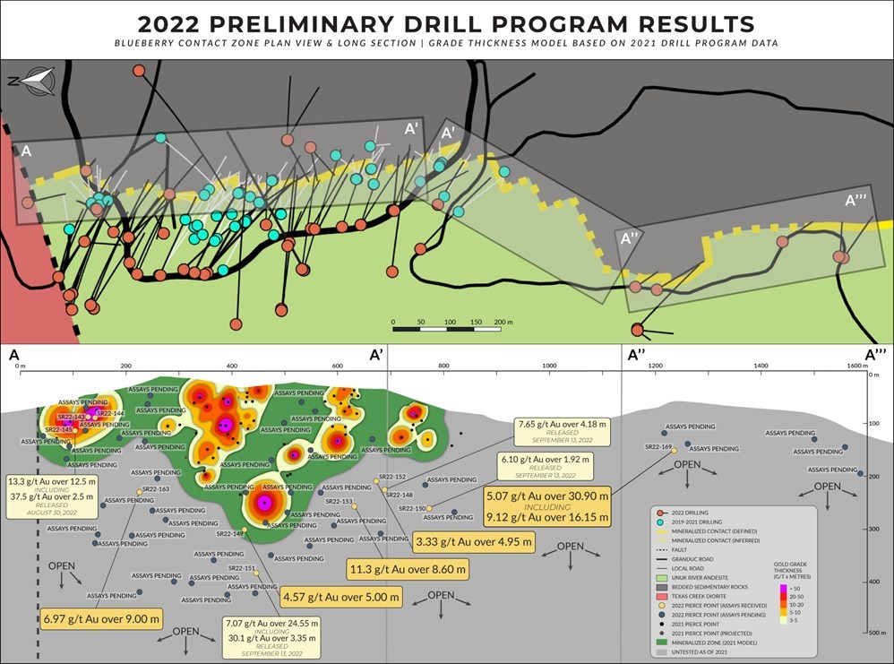 President und CEO Brad Rourke: "Eines unserer Hauptziele dieser Bohrsaison war es, die Tiefe der Zone Blueberry Contact zu erweitern. Dieser erste tiefe Test erhöht die Tiefe der Mineralisierung um 60 % auf insgesamt 360 Meter, und wir haben mehrere tiefere Bohrlöcher, die noch auf ihre Ergebnisse warten. Unser Programm 2022 ist weiterhin in vollem Gange, wobei drei Diamantbohrgeräte weiterhin die Zone Blueberry Contact erproben. Angesichts der positiven Bohrergebnisse zu Beginn der Saison und der Ergebnisse der vor kurzem gebohrten Löcher haben wir beschlossen, das Programm auf 16.500 Bohrmeter zu erweitern, um zusätzliche Erweiterungsziele entlang des Kontakts zu erproben. Da in dieser Saison bereits über 75 Bohrlöcher gebohrt wurden und bisher nur 6 gemeldet wurden, freuen wir uns darauf, im Laufe des Herbstes positive Nachrichten zu liefern."