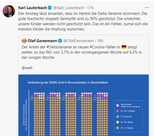 Zu früh mit dem Kopf durch die Wand zu wollen nützt auf jeden Fall nix. Ich für mich warte erstmal ab, was im Winterhalbjahr passiert. Möglicherweise mischen sich ja die Karten neu, wenn es im nächsten Frühjahr nicht mehr wegzudiskutieren ist, daß die Geimpften schlechter abgeschnitten haben als die Ungeimpften.