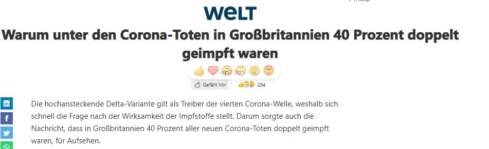 • Experten wie der Mannheimer Statistik-Professor Christoph Rothe sehen in der Zahl der doppelt Geimpften unter den Toten (Stand 3. Juli: 18 pro Tag) jedoch eine „Erfolgsgeschichte“ – und zwar der Impfkampagne in Großbritannien. ...Zur besseren Erklärung greift Rothe zu einer Analogie: „Mit Meldungen wie ,40 Prozent aller neuen Corona-Toten war geimpft‘ verhält es sich ähnlich wie mit ,70 Prozent aller Verkehrstoten war angeschnallt‘“, schreibt er auf Twitter.