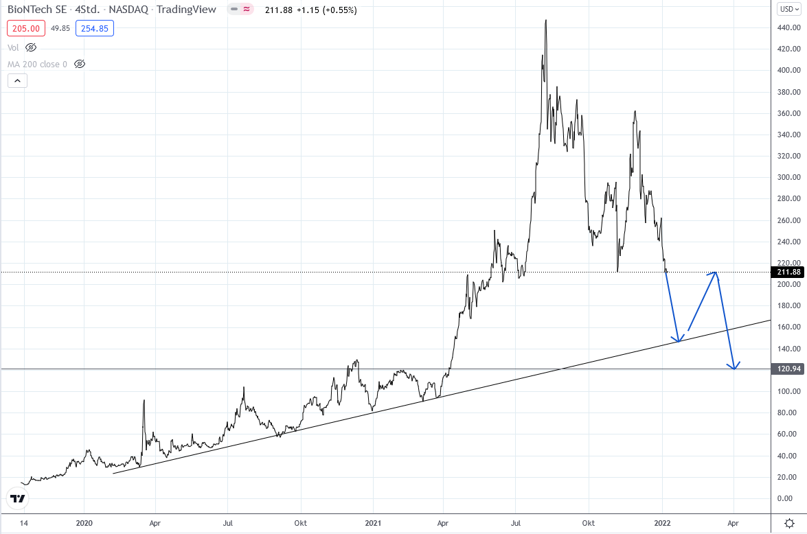 • Vom Chartbild der Biontech Aktie her würde ich sagen, das sieht nicht gut aus. Da könnte man auch einen weiteren Absturz bis in den einstelligen Euro Bereich vermuten.