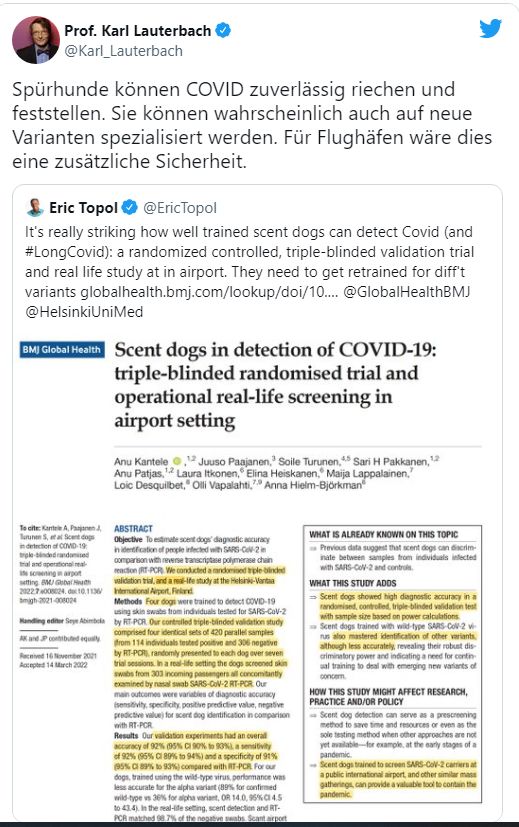 IN FLUGHÄFEN Lauterbach will Corona-Schnüffler einsetzenIm Kampf gegen Corona schlägt er vor, Hunde einzusetzen. Auf Twitter schreibt Lauterbach: „Spürhunde können Covid zuverlässig riechen und feststellen. Sie können wahrscheinlich auch auf neue Varianten spezialisiert werden. Für Flughäfen wäre dies eine zusätzliche Sicherheit.“