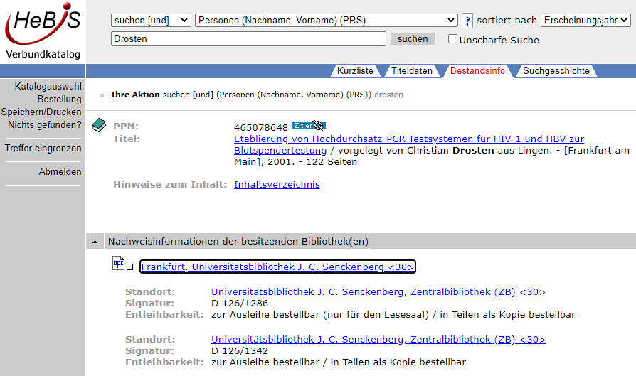 Das liegt am verblödeten HeBIS (Hessisches BibliotheksInformationsSystem), man muss die Suche manuell vornehmen, Link geht nicht. Wenn nach Personen suchst, Drosten eingeben, zweite Seite dann.