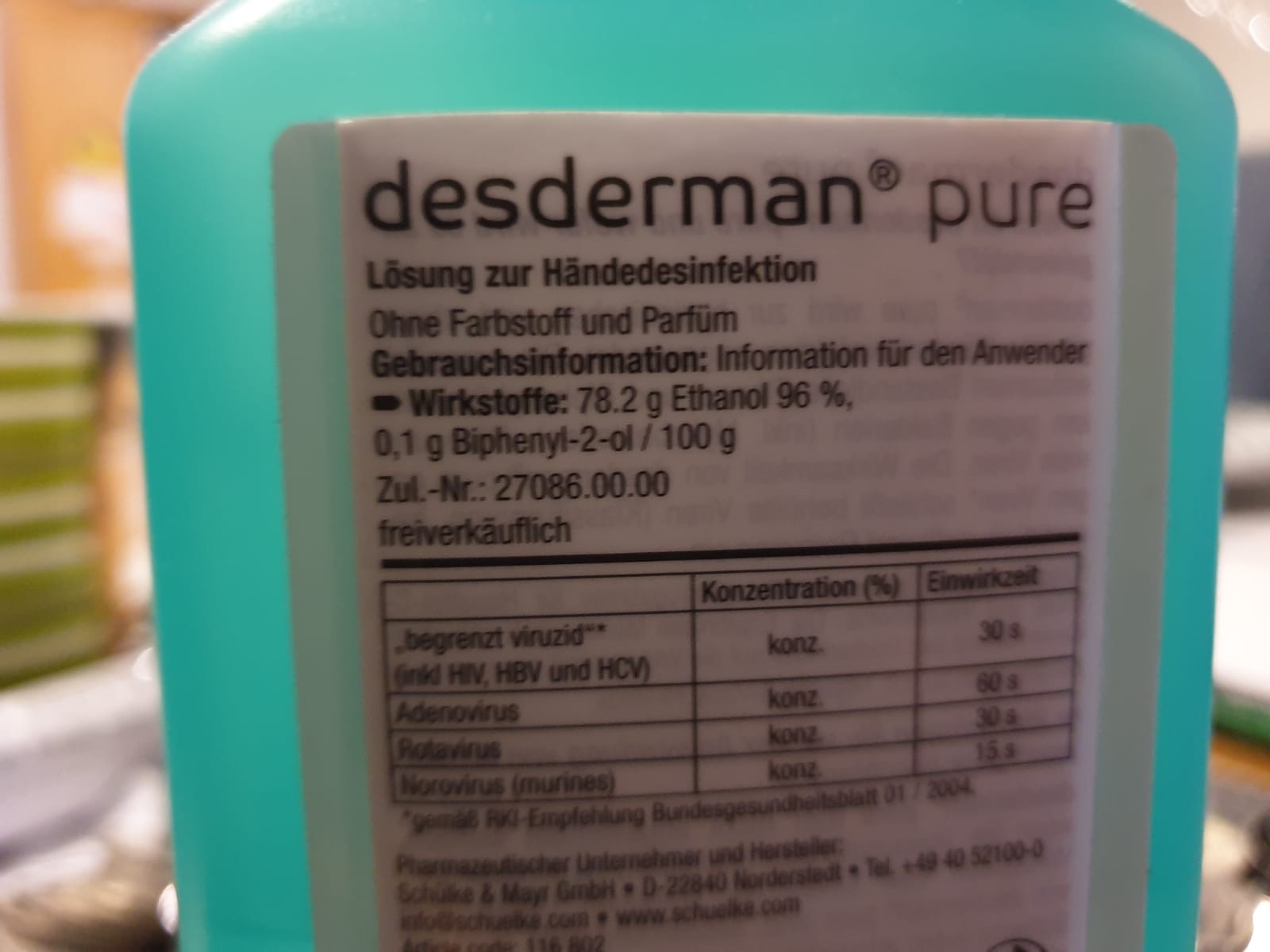 Für die Hände nehme ich desderman pure von schülke. 96% Ethanol