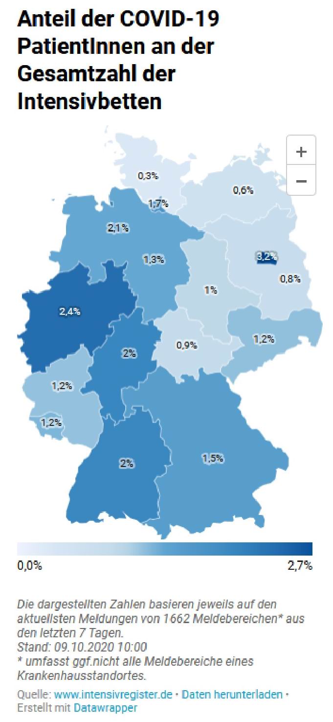 Im DIVI-Intensivregister sind momentan 296 Covid-Patienten verzeichnet, die auf Intensivstationen untergebracht sind, 166 davon werden beatmet. Damit benötigen mehr als die Hälfte aller Corona-Patienten auf der Intensivstation auch eine künstliche Beatmung. Bisher wurden insgesamt 17.309 Menschen auf den Intensivstationen in Deutschland wegen des Coronavirus behandelt.