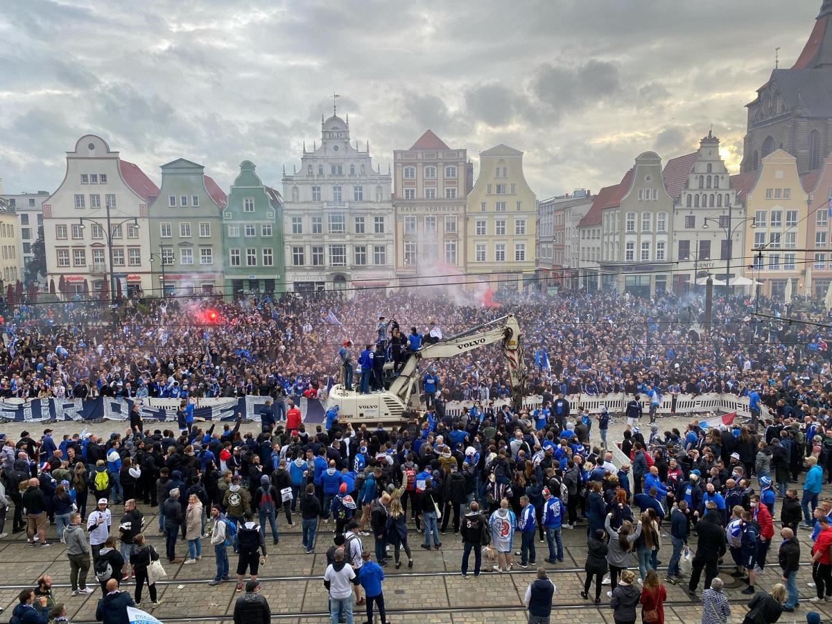"Schauen Sie. Genau aus diesem Fenster hier habe ich am 22. Mai auf 7000 Menschen geschaut, die den Aufstieg von Hansa Rostock gefeiert haben. Ohne Maske, bestens gelaunt, sehr eng beieinander. Mein Gott, dachte ich damals, hoffentlich geht das gut.