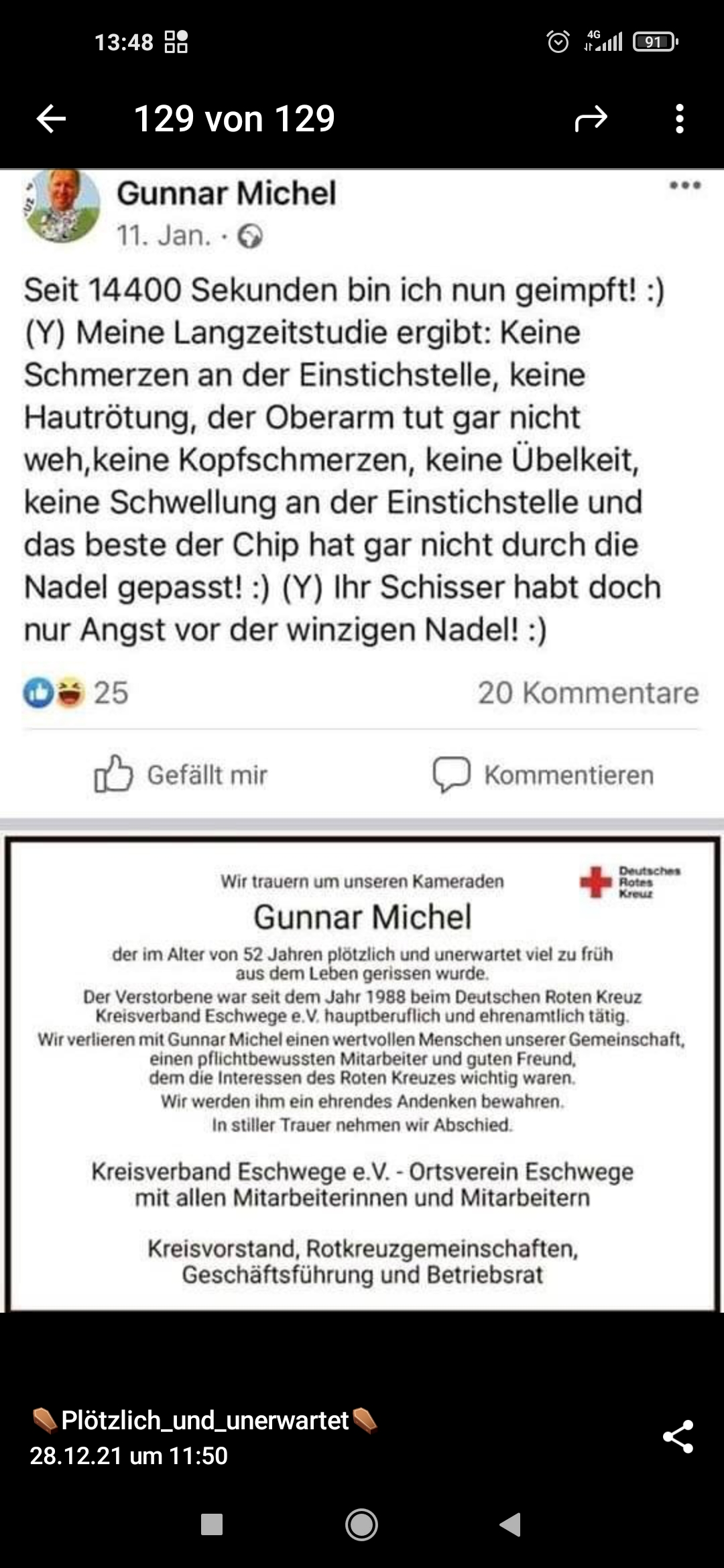 Nun, die Nachbarin ist mehrfach gentherapiert und vor einer Woche wurde bei ihr mittels eine zweifelhaften Tests und einer Bestätigung mittels eines weiteren zweifelhaften Tests, asymptomatisches C19 diagnostiziert. Seitdem sitzt sie zwecks gesetzlich verordneter Absonderung daheim in Einzelhaft. Sie war Juchhee pro Gentherapie!