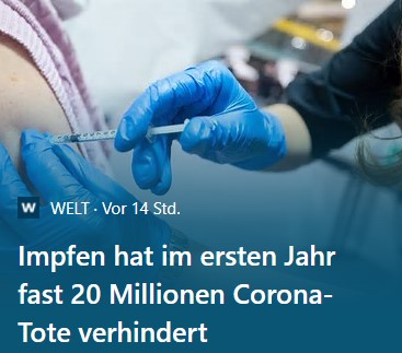 Die Corona-Impfungen haben in ihrem ersten Jahr einer aktuellen Modellierung zufolge weltweit fast 20 Millionen Covid-19-Tote verhindert. Damit sei die Zahl der ohne Impfungen erwarteten Todesfälle mehr als halbiert worden, schreiben Forscher des Londoner Imperial College.